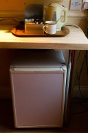 How nice to have a little refrigerator along with coffee and tea facilities!