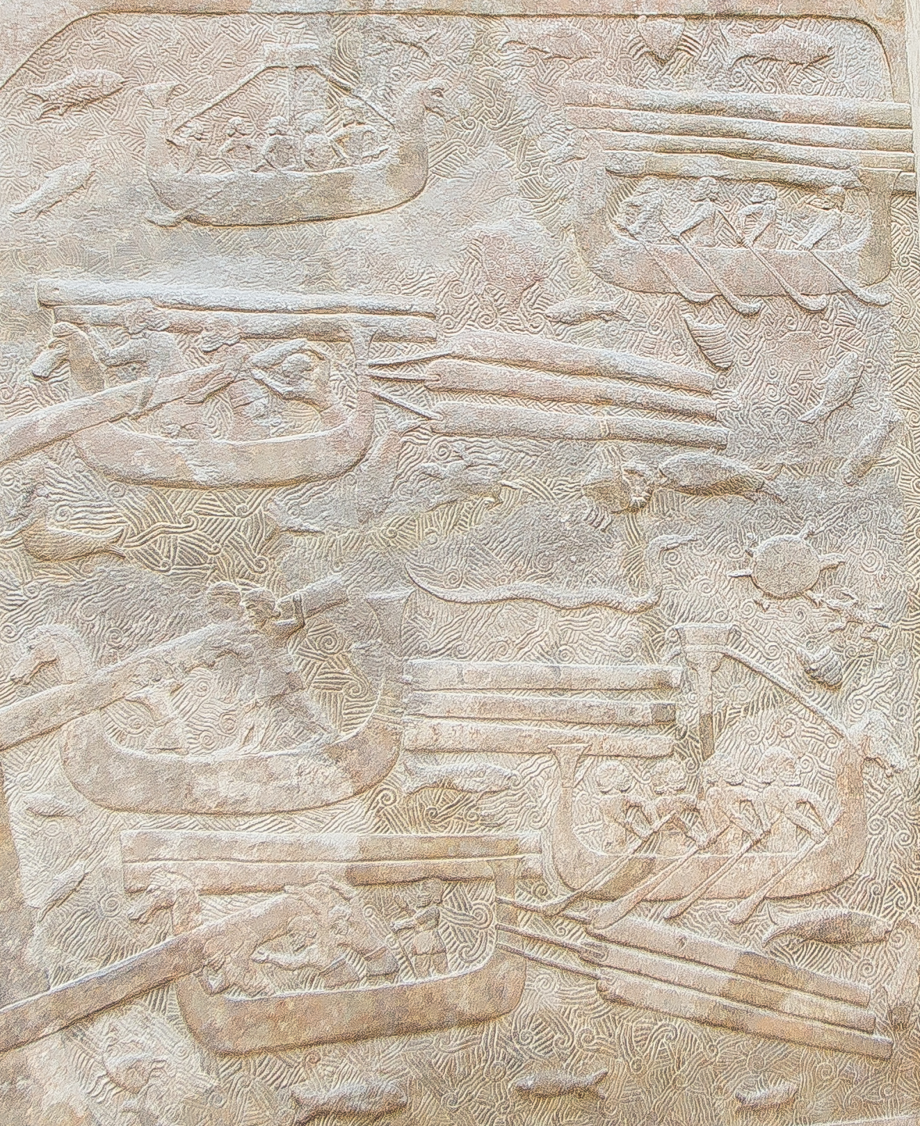 In the above slab, three mythical and wondrous beings, a merman (complete with beard!) and two winged bulls, serve as guardians during the transport of the timber over the waters.